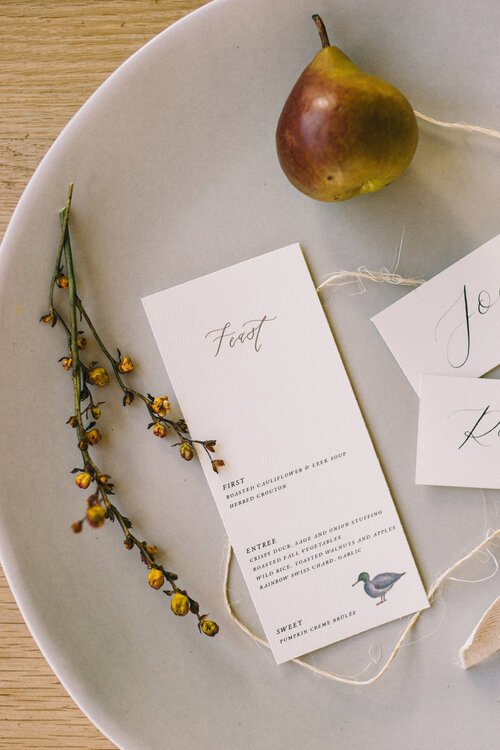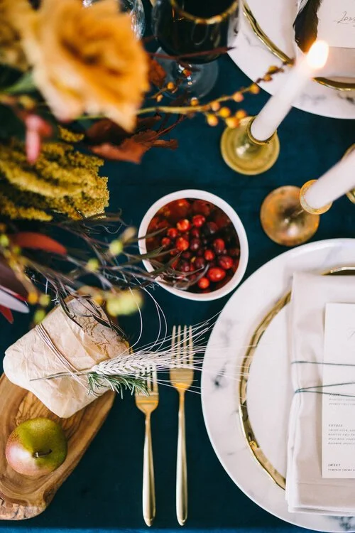 Taking full advantage of having the beautiful space at Pepperrell Cove for the day, we used the first half to design a cozy, feast inspired tablescape around our “Duck” theme. {we will get into that later ;)} and do a full styled shoot table design sprinkled with dried florals, velvet linens and candlelight. Take a peak into what we created to get all the festive November design feels.