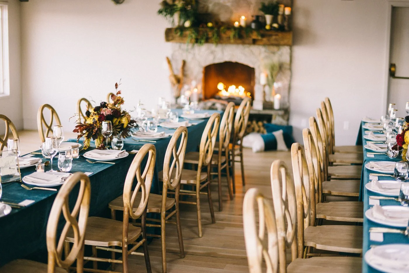Nothing says cozy like a sit down candle lit dinner by the fire. We love a venue with a fireplace that we can dress up! In fact, we hope you can take away some holiday inspiration from this to give your fireplace a little face lift for when you host your Thanksgiving dinner; {Grandma will love it}. Velvet textures, candlelight and throw pillows/blankets will never go out of style when it comes to cozying up in Maine.