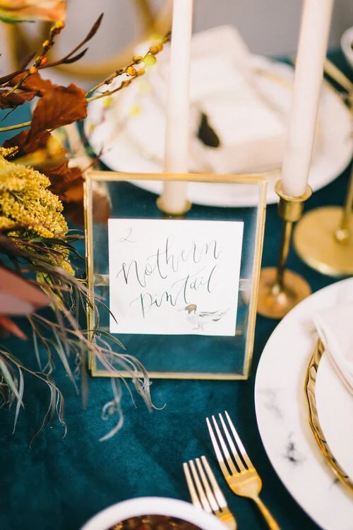 Our guests each received a hand carved, painted duck with a fabric escort piece beautifully calligraphed by our girl, Ridgely Calligraphy, which led them in the direction of their table topped with a duck species name in place of a table number and feather accented place setting.