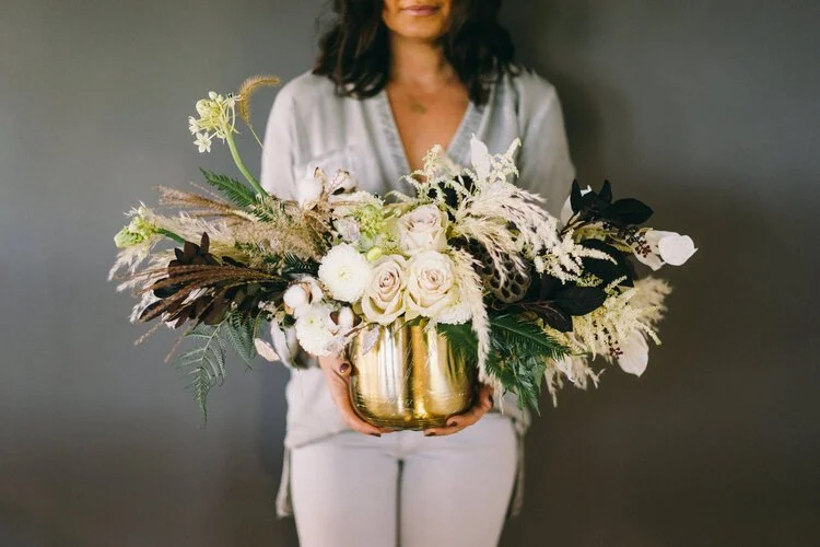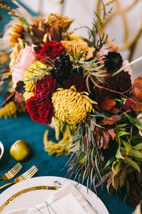One of our favorite trends is the concept of taking everything you love about a certain season, and bringing that inside; especially when New England weather turns too crisp to host an outdoor gathering. To play off the vibe from fall in Maine, we worked with F as in Flowers to create floral arrangements of dried greenery and blooms blended with fresh florals to emphasize the changing of the season that comes with the fall harvest. In addition to the florals, we used a cozy color palette with velvet linen textures and pops of gold to resemble the golden, crispy leaves falling from the trees.